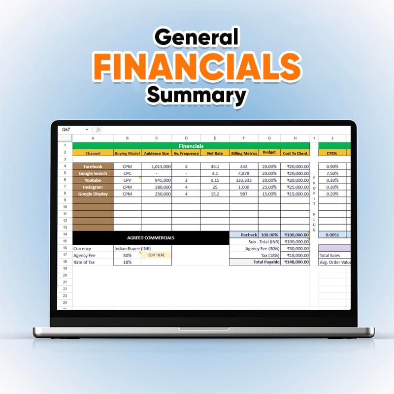 - General Financials Summary: A breakdown of your overall ad spend and expected returns.
